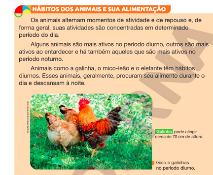Figura 3 - Unidade 3 – Observando os Animais. Ponto 6: Alimentação dos animais. A imagem, com breve introdução textual acerca dos hábitos alimentares dos animais, traz uma fotografia de galinhas alimentando-se em um ambiente aberto, com gramíneas verdes.